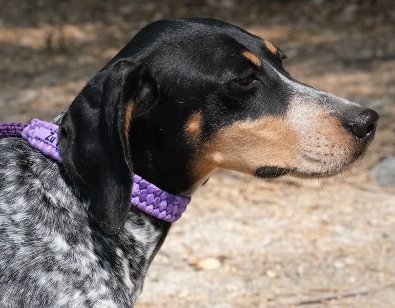 An der Leine läuft die mittelgroße Lady vorbildlich mit und im Wald kommt ihr eigentlich fröhliches und neugieriges Wesen öfter schon zum Vorschein.