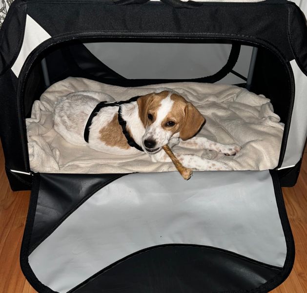 Das letzte Ticket hatte die scheue Esme ergattert. Sie hatte sich ganz hinten in ihrer Box zusammengerollt und harrte der Dinge, die da auf sie zukamen. Da die Atmosphäre am Flughafen die zurückhaltende Hündin zu überfordern schien, wurde sie kurzerhand von Box zu Box umgeladen. Ihr neues Frauchen zügelte in Esmes Interesse ihre eigene Neugier und verschob die direkte Begrüßung bis sie in der ruhigen Atmosphäre des Für-Immer-Zuhauses stattfinden konnte.