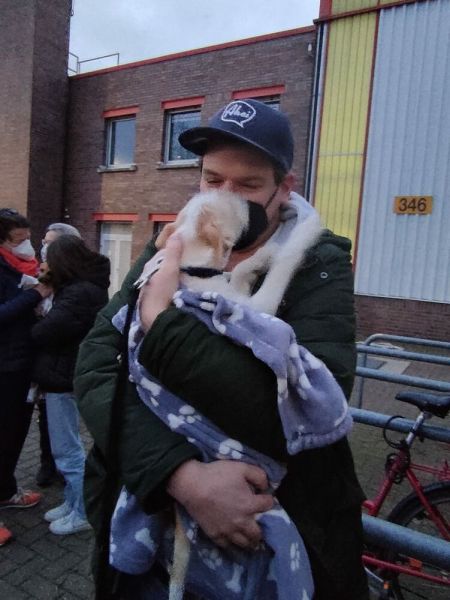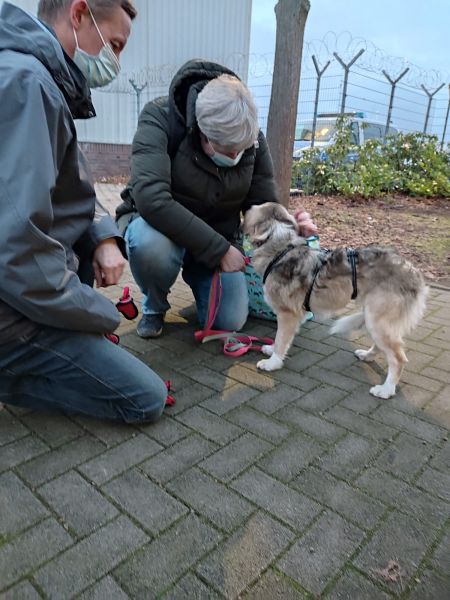 Auch unsere Storm stiefelte neugierig und überaus zutraulich aus der Reisekiste in die Arme ihrer neuen Menschen. Nach einer ausgiebigen Begrüßung und beidseitigem Beschnuppern wurde der Heimweg angetreten, wo schon die ersten Abenteuer und vor allem Kuscheleinheiten auf die süße Hundedame warten.