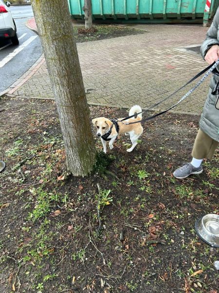Die kleine Yinka wartete geduldig in ihrer Box bis auch sie in die offenen Arme ihrer neuen Familie übergeben wurde und war sehr angetan von der ganzen Aufmerksamkeit und den Kuscheleinheiten. Sie ließ sich geduldig ihr Sicherheitsgeschirr anlegen um dann „Stolz wie Bolle“ mit ihrem Frauchen an der Leine die Umgebung beschnuppern zu gehen.