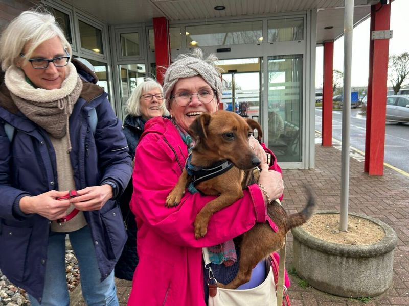 Die lustige Florrie verlieh ihrem Wunsch, unbedingt als erste aus der Box zu wollen, deutlich Nachdruck: sie schlug mit ihrer freudigen Route so sehr, dass das Klopfen an der Box nicht zu überhören war und das Ankunftsteam ihren Wunsch gern erfüllte. Selbstbewusst und sicher stolzierte Florrie denn auch aus ihrer Reisebehausung, um sogleich von ihrer neuen und überglücklichen Familie in die Arme geschlossen zu werden. Bei Frauchen flossen die Freudentränen und Florrie wedelte auch auf dem Arm einfach fröhlich weiter.