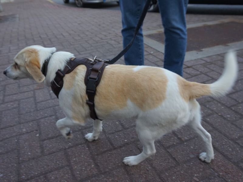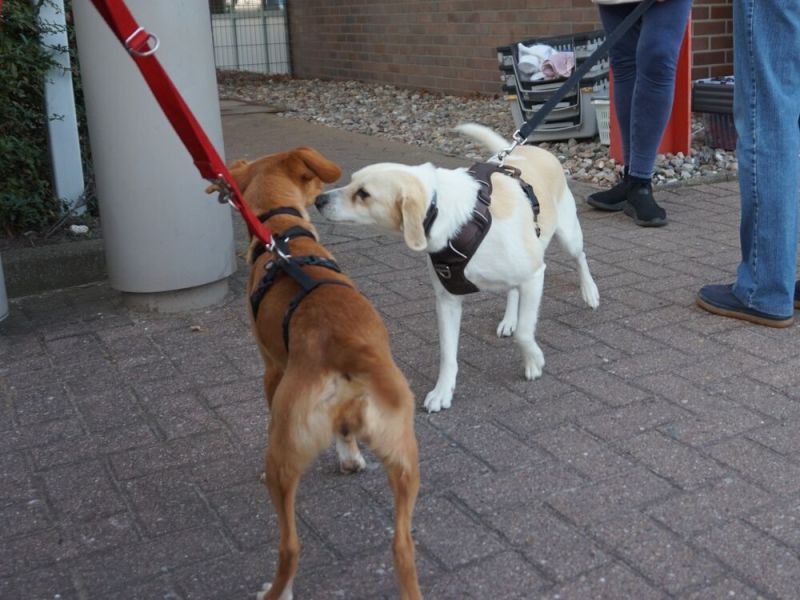 Die etwa 2-jährige Fiore durfte als erste ihre Flugbox verlassen und sich die Beine vertreten. Mit ihrer Pflegemama im Schlepptau drehte die Mischlingshündin erst einmal