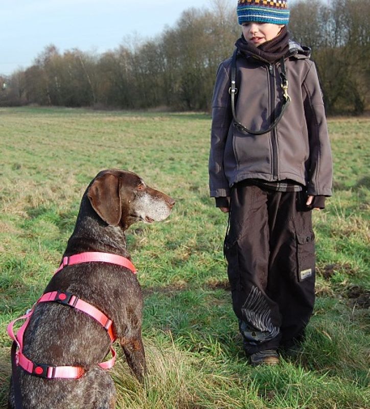 Sie sucht gerne Stöcker, die ich angefasst habe im Unterholz und spielt auch ein wenig mit ihnen. Man kann mit ihr über Futter arbeiten/trainieren. Sie hört schon toll auf Rückruf. "Sitz" und auf ihren Platz gehen hat sie verstanden. Stacey fährt ohne Probleme mit dem Auto mit und kann auch darin warten.
