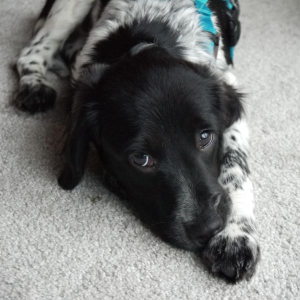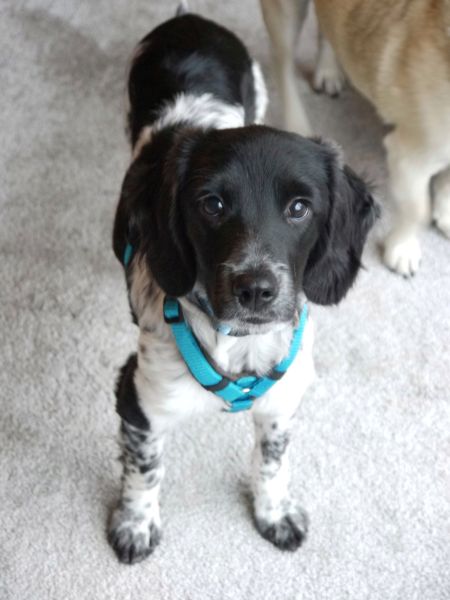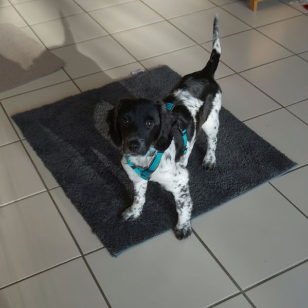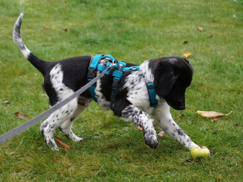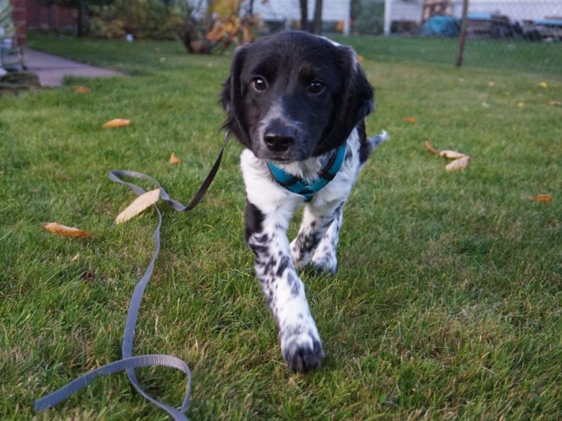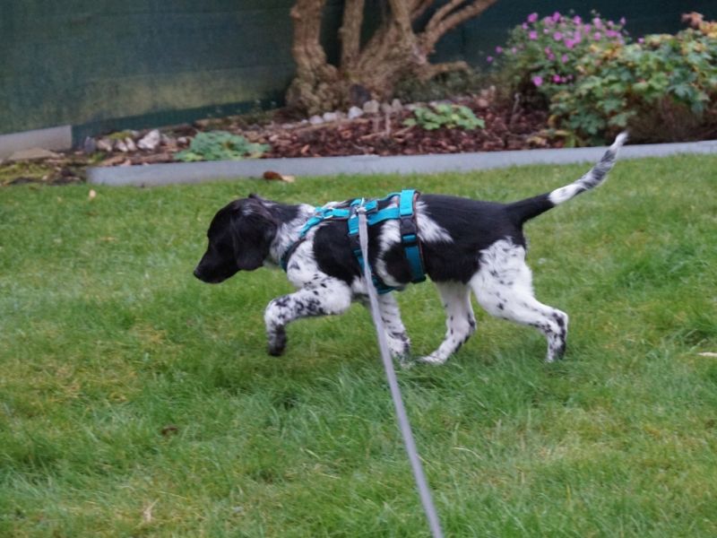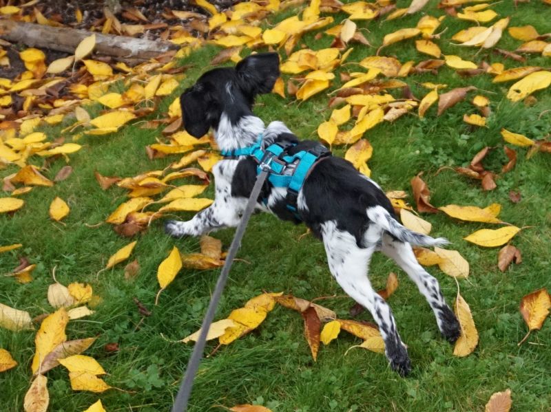An der Leine läuft der kleine Strahlemann prima mit, mal voraus und mal im Pulk. Er erkundet die Umgebung wie auch den Garten mit kindlichem Staunen, die fallenden Blätter sind eine wunderbare Einladung zum Spielen. Alltagsgeräusche und Verkehrslärm erschrecken ihn nicht im geringsten.