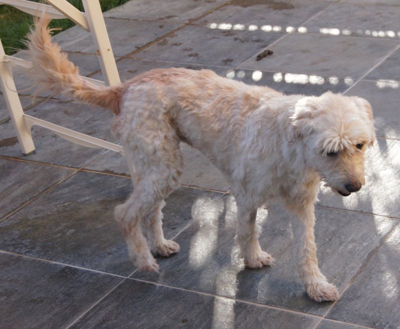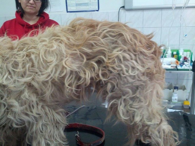 Sie hatte einen Hund am Straßenrand gefunden, das Fell war sehr verschmutzt und verklettet, der Hund lag da und rührte sich nicht mehr, auch reagierte sie nicht auf Ansprache und atmete ganz flach.
