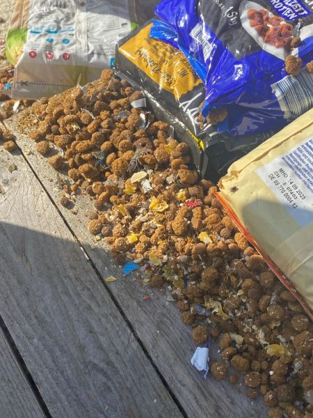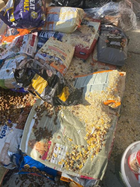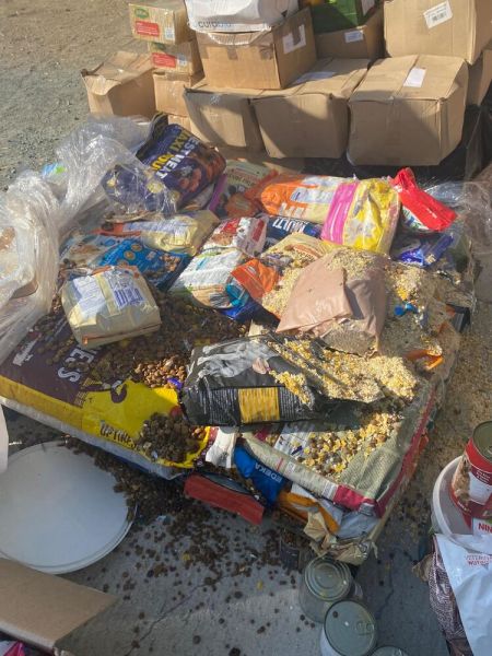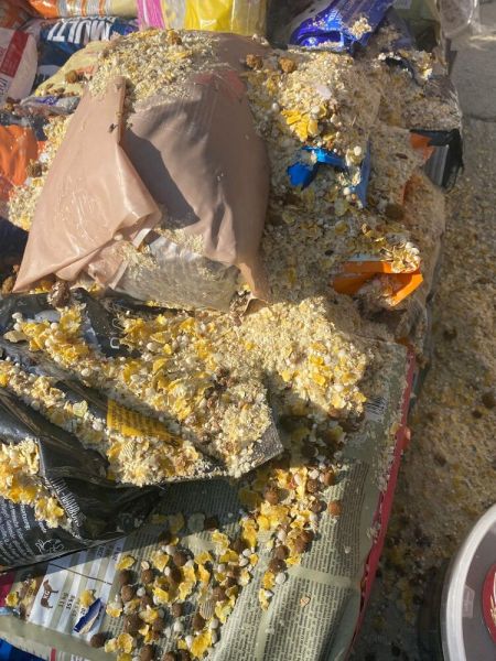 Besonders schmerzlich war, dass es den Ratten auch gelang, in eine der reinen Futterpaletten einzudringen. Ein Teil des Futters musste daher ebenfalls entsorgt werden, selbst dort, wo es auf den ersten Blick noch teilweise unversehrt erschien. Das ist doppelt bitter: Das Futter wird dringend benötigt, und unsere Spenderinnen und Spender haben sich große Mühe gemacht, diese Hilfe auf den Weg zu bringen.