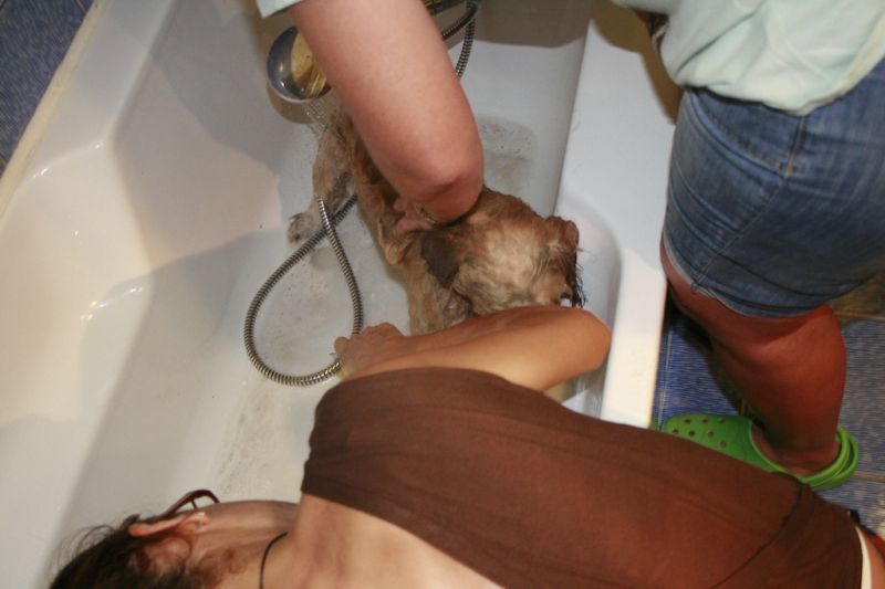Sie fuhr dann mit Muffin zu einer Tierschutzfreundin, die sie zwischenzeitlch informiert hatte, um Muffin zu baden. Nach einer guten Stunde in der Badewanne, war uns klar, dass wir gegen die Floh- und Zeckenflut auf seinem Körper nicht gegen an kommen und er am nächsten Morgen nicht nur zum Tierarztcheck, sondern auch 'Hundewaschspezialisten' muss. Muffin hat noch die ganze Nacht Zecken und Flöhe abgeschüttelt und der Hundefriseur hat am nächsten Morgen nochmals zwei Stunden gebraucht, um Muffin ganz von dem Ungeziefer zu befreien.