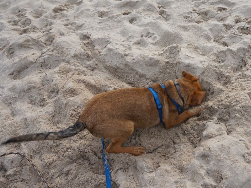 Zeit im Garten liebt Travis sehr, wobei es bei Regen Glückssache ist, ob er eine Pfote vor die Tür setzen mag. Draußen angekommen jagt er an der Schleppleine entweder mit großer Begeisterung dem Hunde-Fußball hinterher oder seine Nase klebt am Boden und er geht jeder kleinsten Spur (vermutlich der Nachbarskatzen) nach. Auch Buddeln bereitet ihm am Strand wie im Garten große Freude, man kann das aber gut unterbinden indem man ihn anderweitig bespaßt.